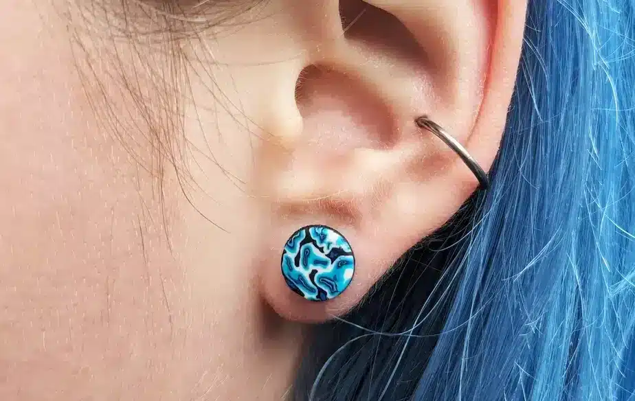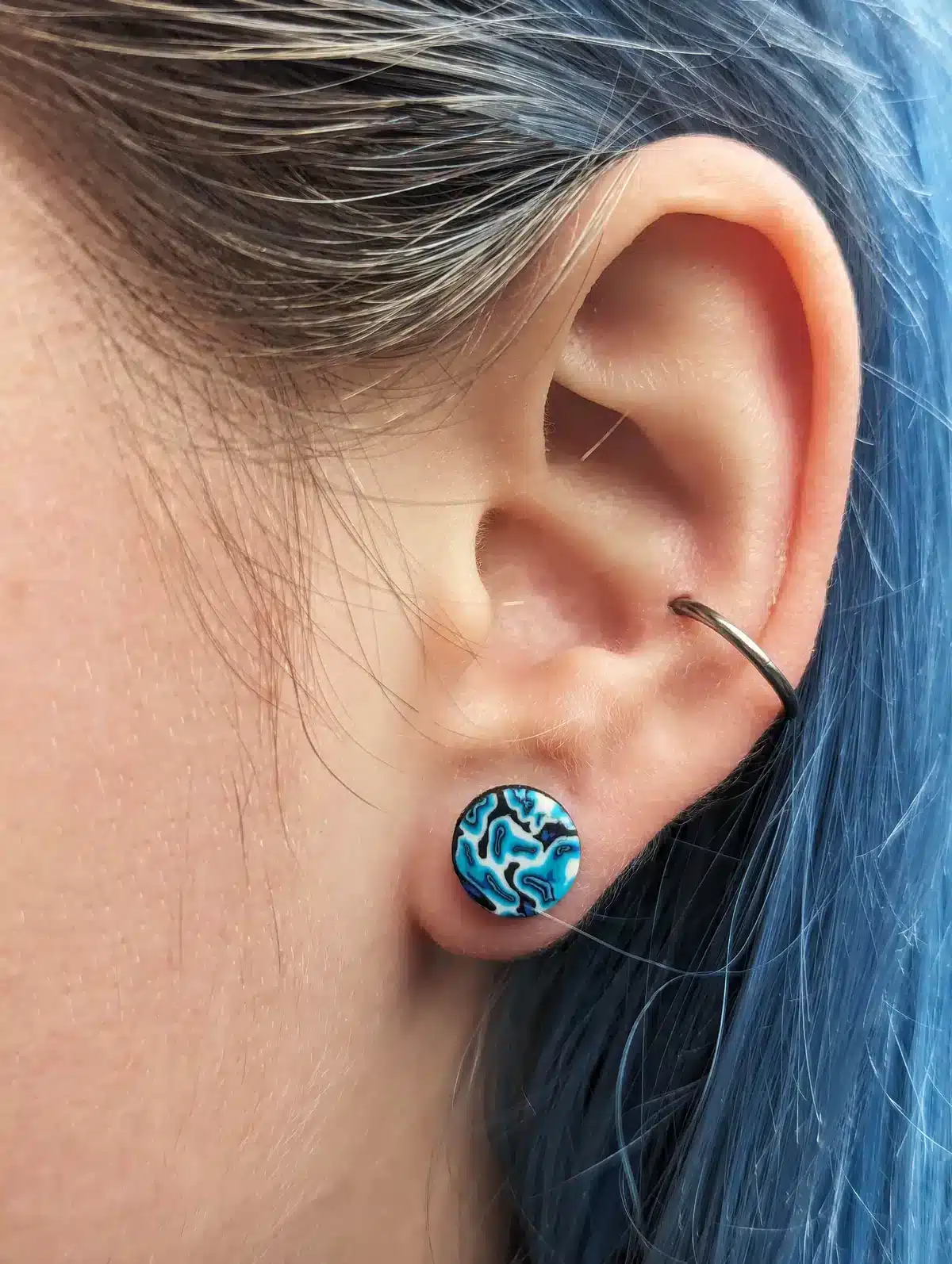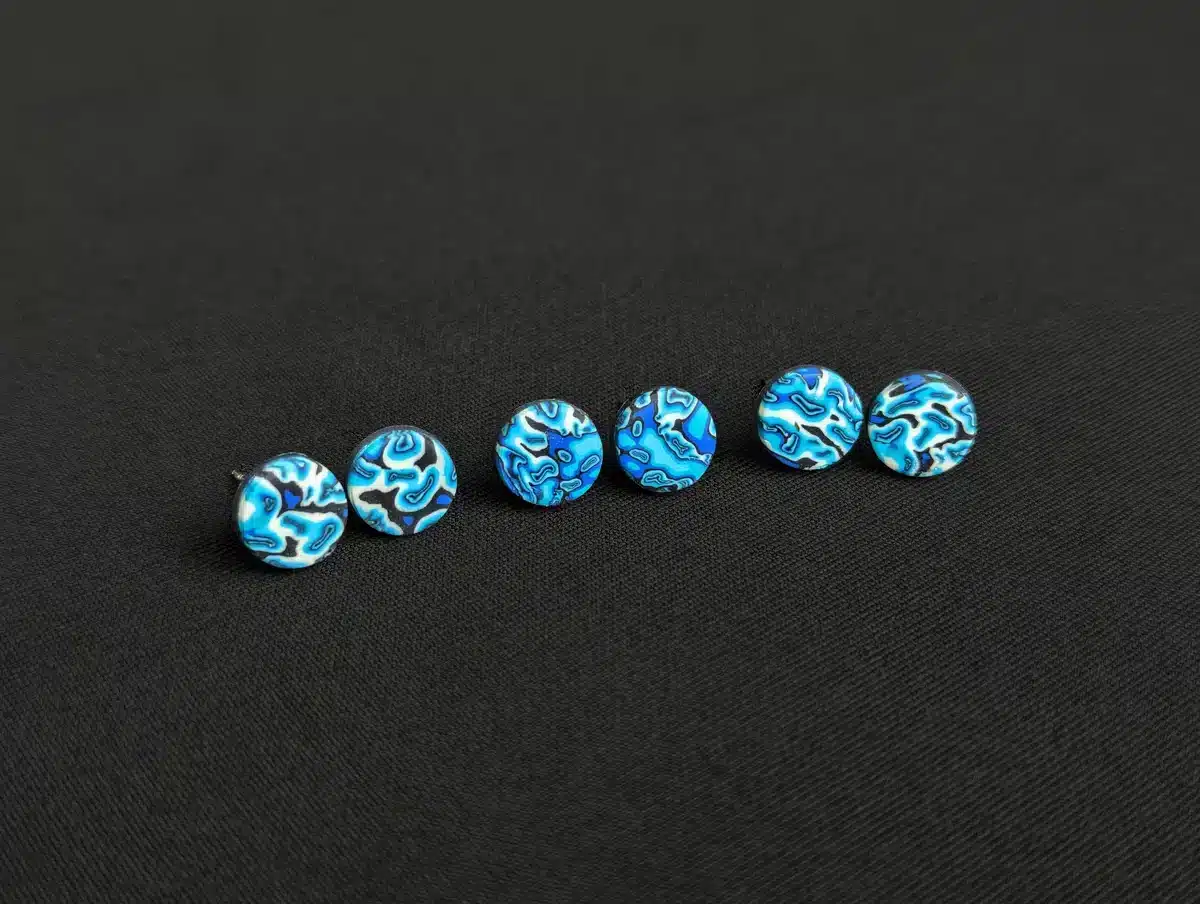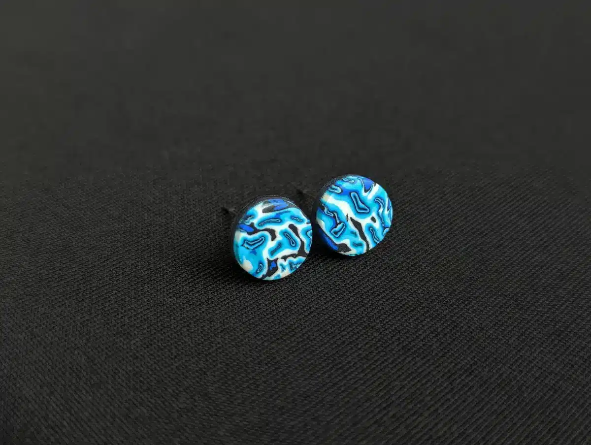 Check these psychedelic ear studs designed with a vibrant Wavy Psychedelic Blue pattern. Each 9mm stud is handcrafted from scratch with a stainless steel stud post backing and fastener, ensuring durability and comfort.