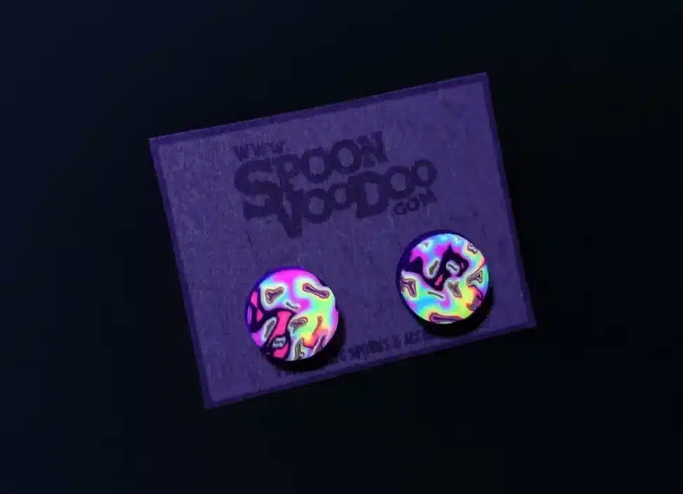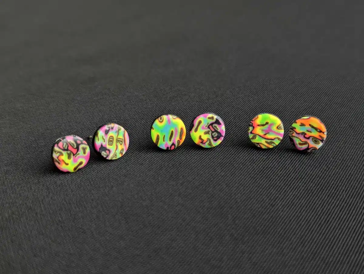 Enhance your nightime style with these unique Psychedelic UV Ear Studs, designed with a vibrant Wavy Rainbow pattern. Each 9mm stud is handcrafted from scratch with a stainless steel stud post backing and fastener, ensuring durability and comfort. Perfect for those frequenting neon gatherings.