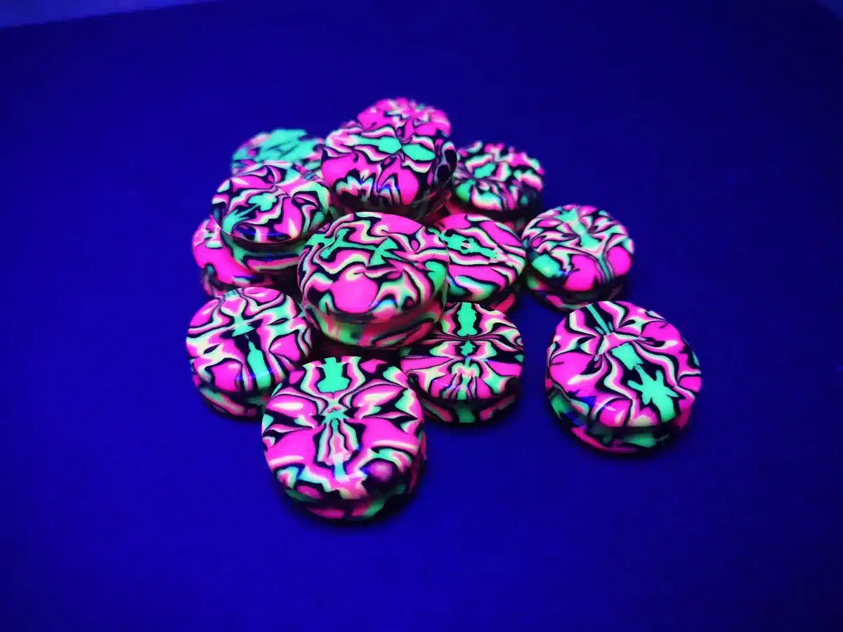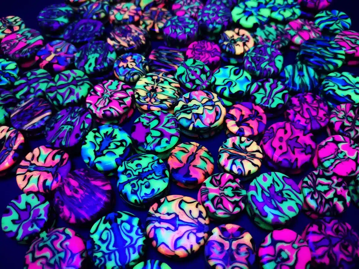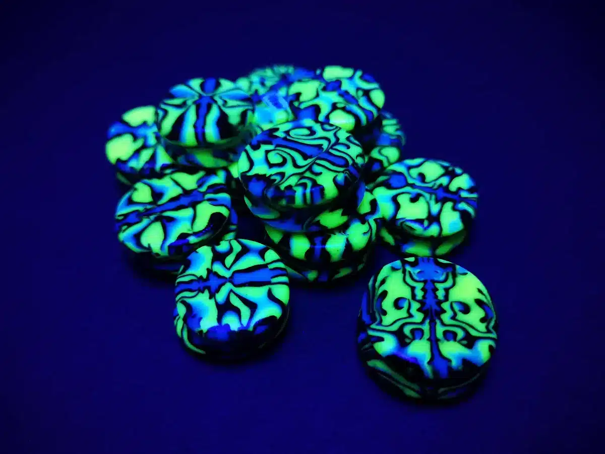 The eye catching psychedelic design looks fantastic in normal lighting conditions, but also fluoresces under UV black lights. Perfect for UV parties or as casual wear.