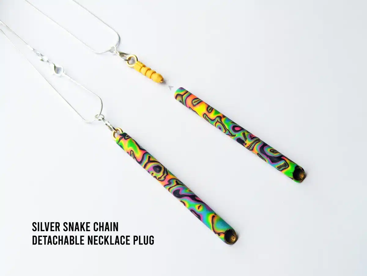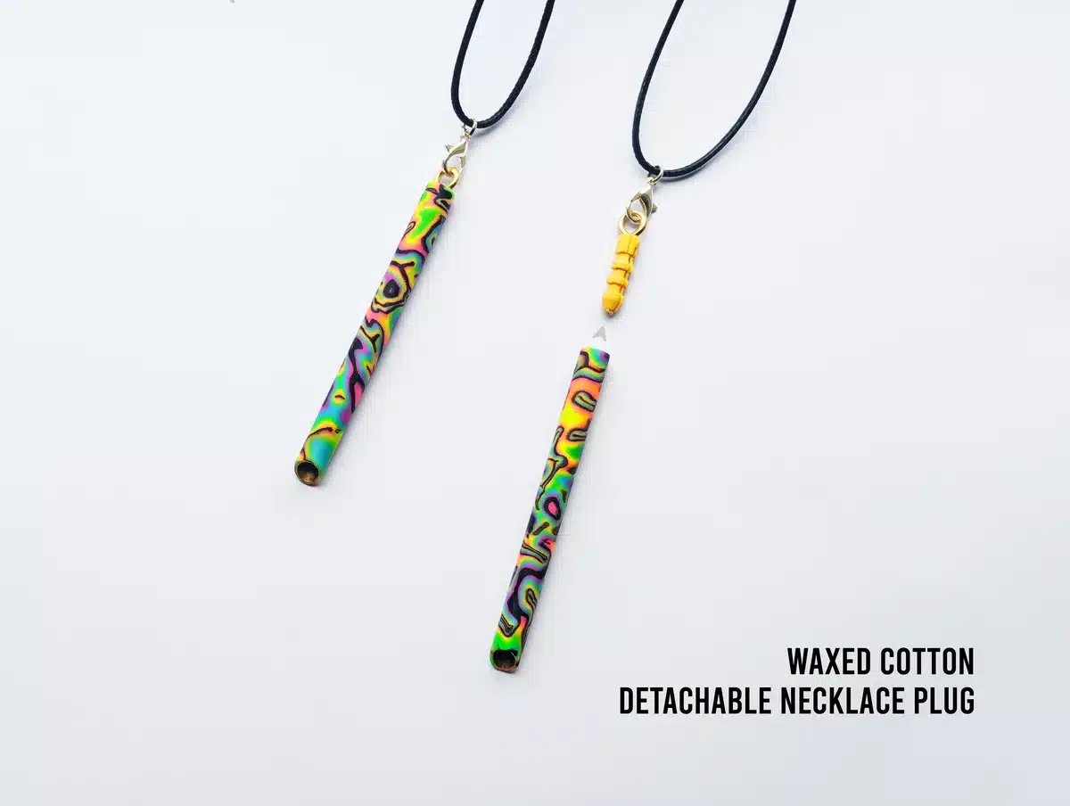 You can now purchase pendants with a Necklace Plug, these plugs offer a sturdy connector so you can wear your pendant wherever you go. Just push the plug into the flat end of the tube to fasten (no need to twist) and pull the plug out with the necklace attached to remove it.
